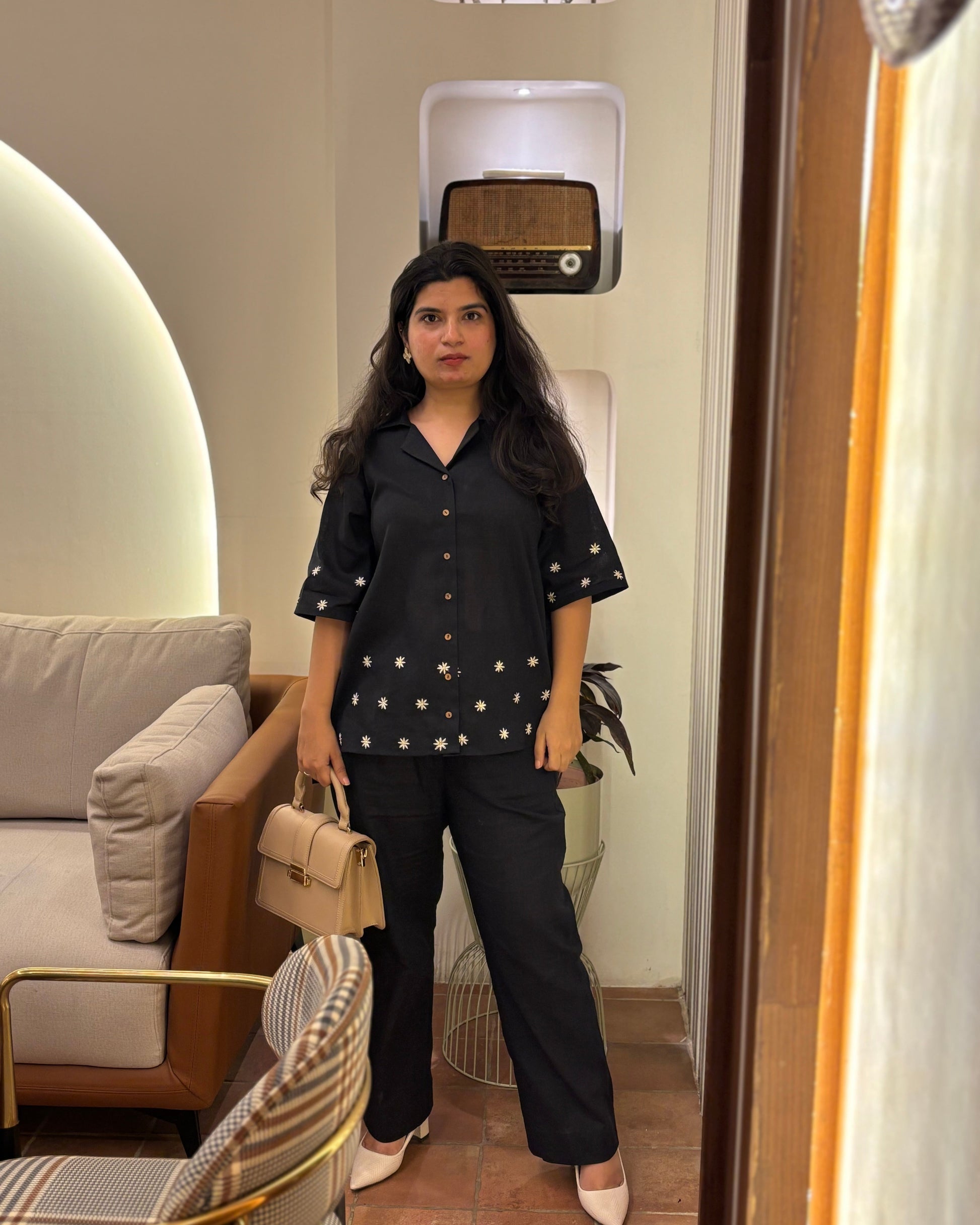 Step into timeless charm with our Daisy Embroidered Co-ord Set, crafted from a luxurious blend of cotton and linen for unmatched breathability and comfort. The delicate daisy embroidery adds a touch of feminine grace, making it perfect for both casual outings and chic gatherings.